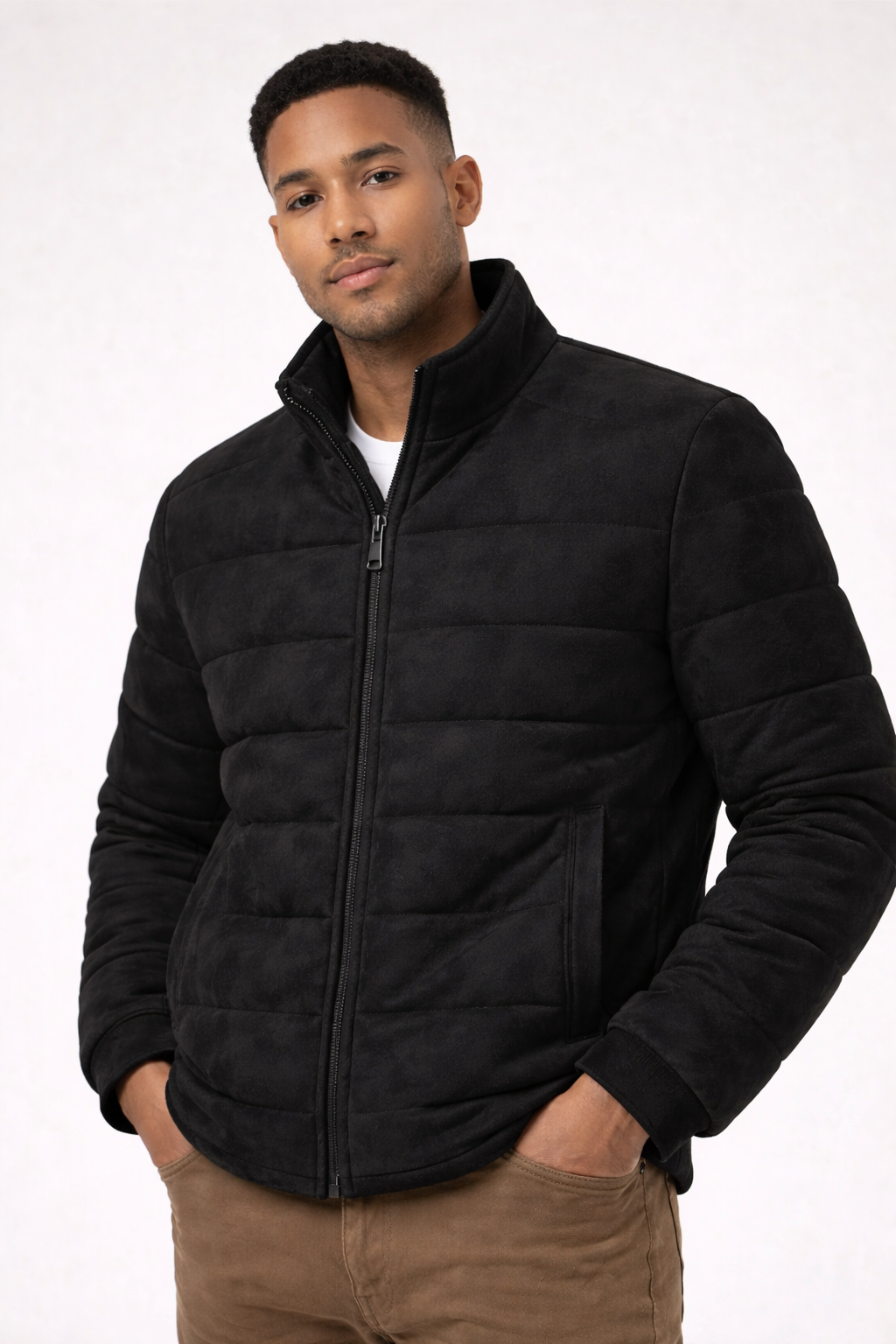 O suede utilizado na confecção da jaqueta confere uma textura macia e aveludada, proporcionando um toque suave e confortável ao vestir. A jaqueta também apresenta um acabamento de alta qualidade que garante durabilidade e resistência.